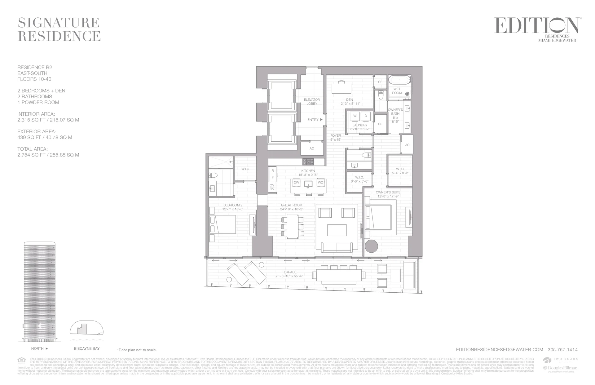 With a similar layout to the east-north b2 this 2-bedroom den 25-bathroom residence covers 2315 sq ft inside and includes a 439 sq ft terrace the open living space leads to the terrace while the high-end kitchen features a breakfast bar the owners suite includes a luxury bath and walk-in closet the additional bedroom has an en-suite bath the unit also includes a powder room and laundry facilities