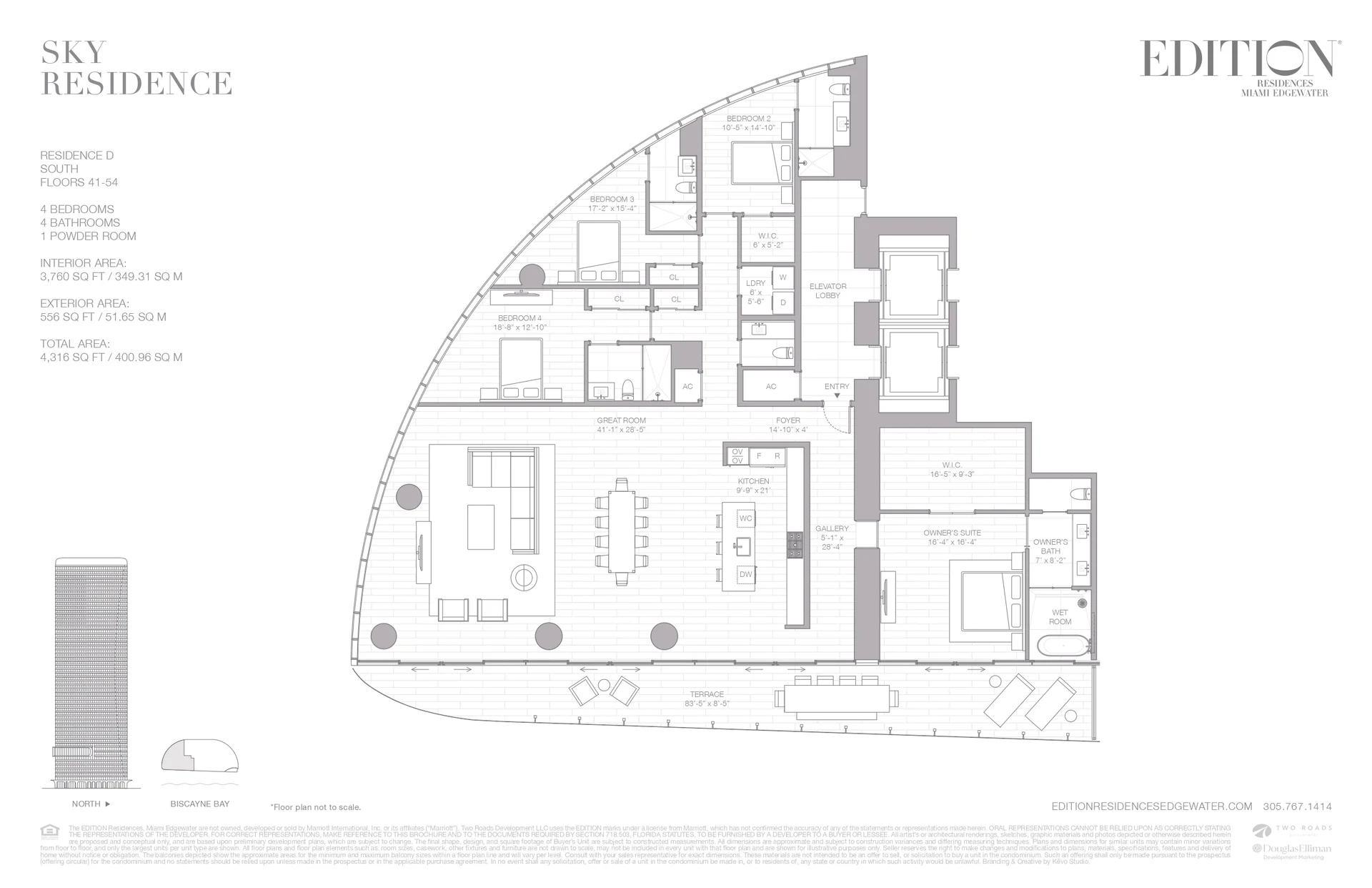 This spacious 4-bedroom 45-bathroom residence offers an interior area of 3760 sq ft and a 556 sq ft terrace the expansive living area features stunning views and a modern kitchen with premium appliances and a large island the owners suite includes a walk-in closet and en-suite bath three additional bedrooms have en-suite baths the unit also includes a powder room ample storage and a large terrace perfect for entertaining